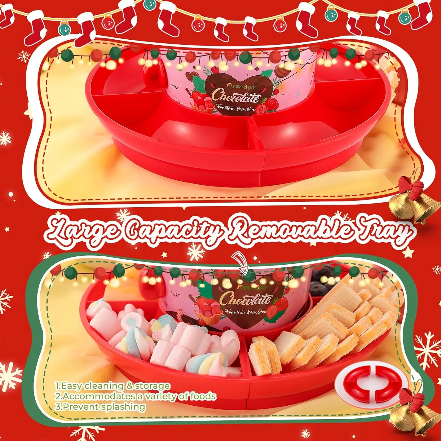 Serving your fondue delicacies has never been easier, thanks to the three-section detachable tray. Not only does it offer spatial efficiency for your dips and delights, but it also promises a swift clean-up, turning the aftermath of a fondue party into a breeze.