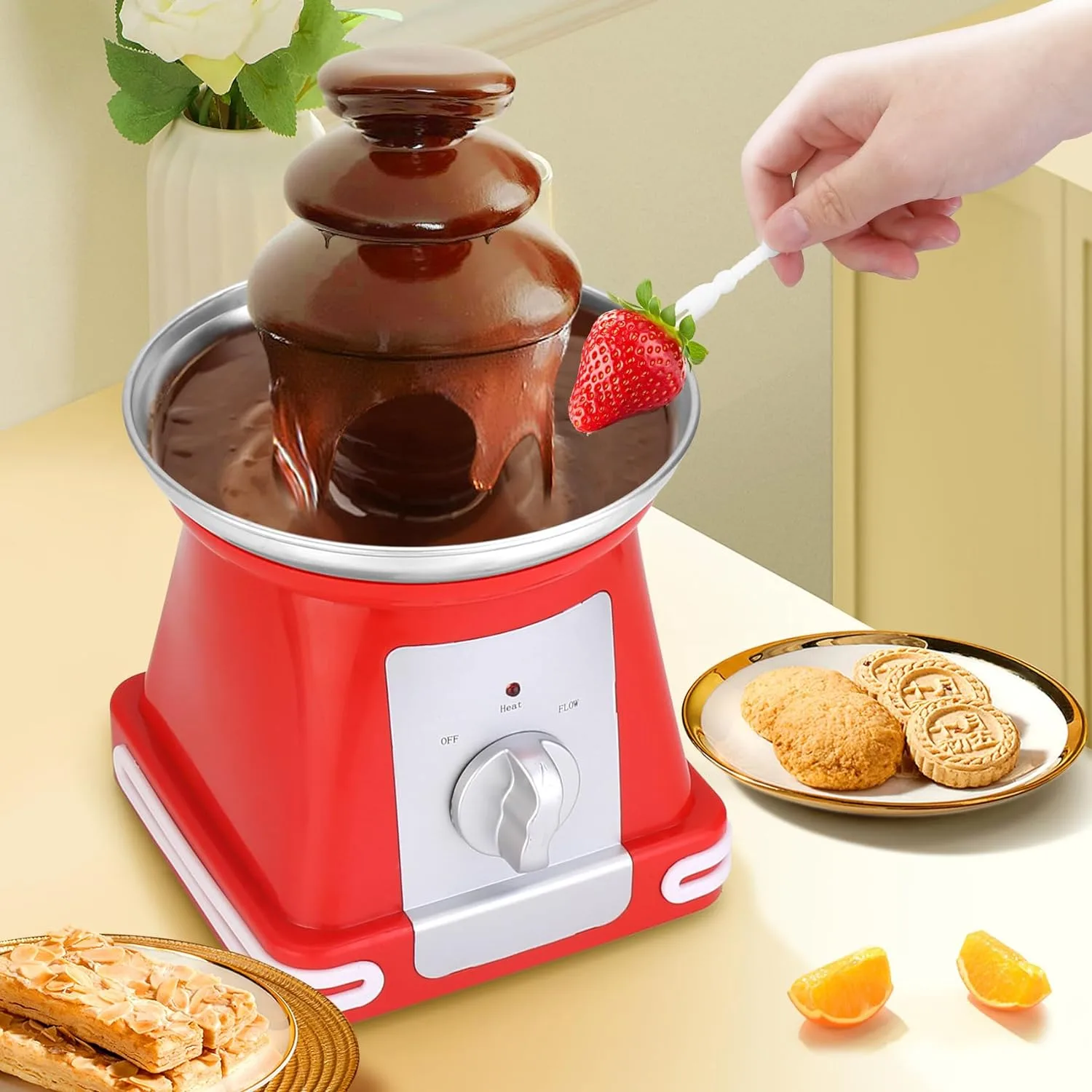 One of the pot’s standout features is its foolproof temperature control. Whether you’re aiming for a velvety chocolate fondue or a creamy cheese dip, the kit’s ability to heat up to 140°F and then maintain a warm setting ensures your fondue is always at its prime for dipping and enjoying.